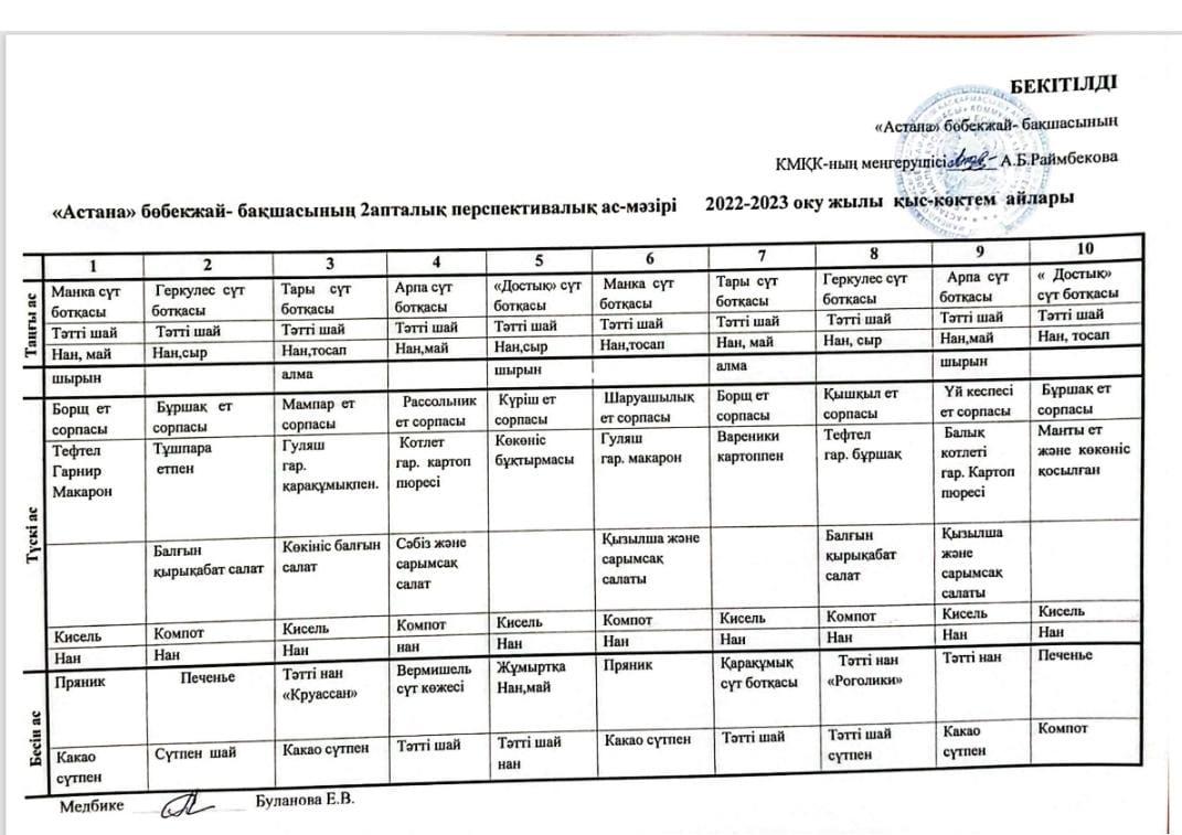 " 10 күндік Ас мәзірі" » "Жамбыл облысы Шу ауданы Шу каласы "акимынын аппараты КММ “Астана” бобекжай- бақшасы” коммуналдық мемлекеттік қазыналық кәсіпорны