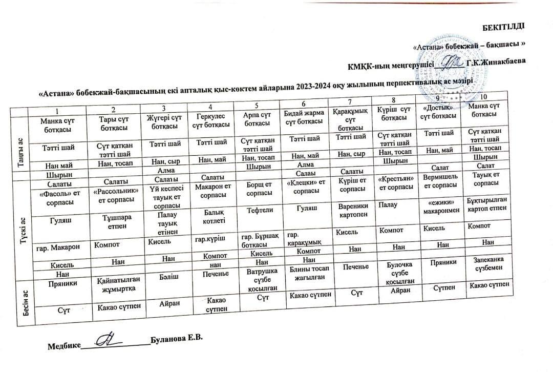 " 10 күндік Ас мәзірі" » "Жамбыл облысы Шу ауданы Шу каласы "акимынын аппараты КММ “Астана” бобекжай- бақшасы” коммуналдық мемлекеттік қазыналық кәсіпорны