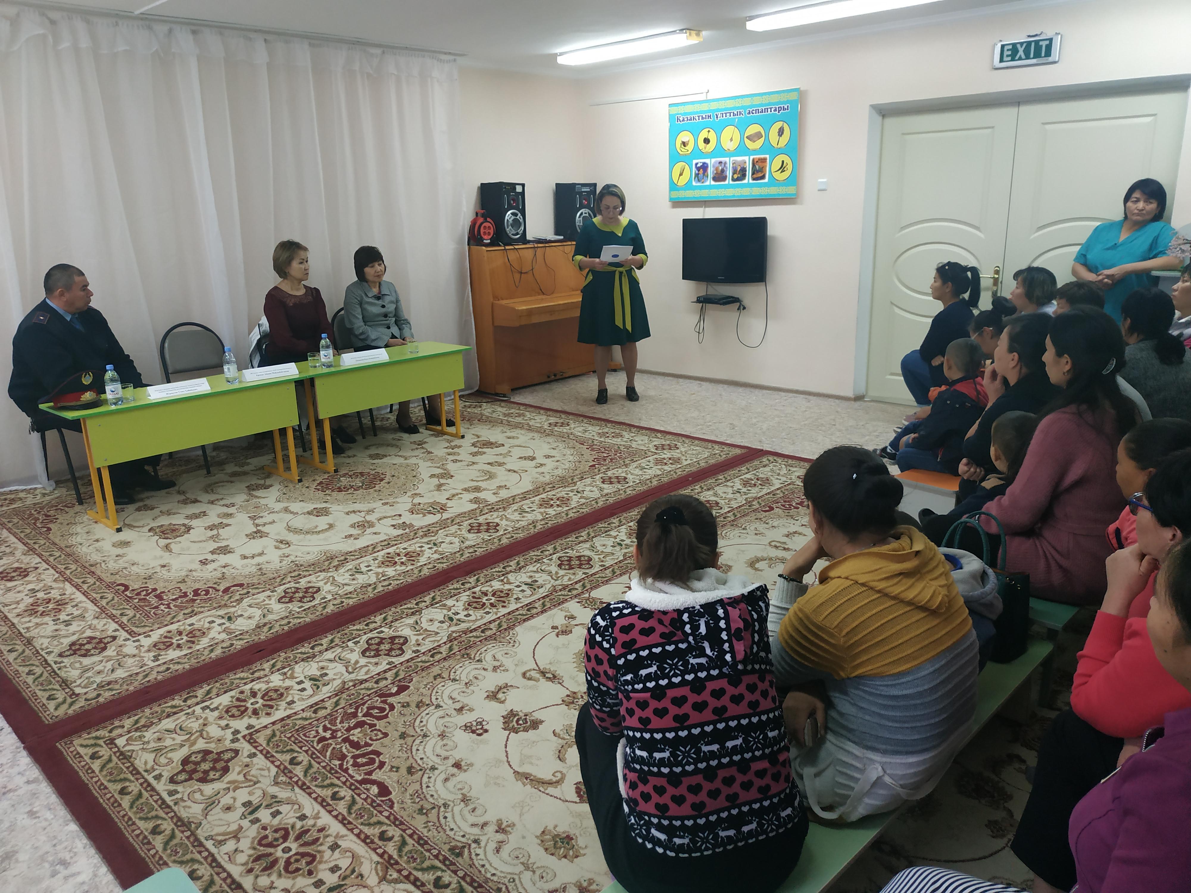 Ағымдағы жылдың 14-қазан күні балабақша меңгерушісі М.О.Хасанбаева педагог қызметкерлер мен ата-аналар арасында бала құқықтары мен әлімжеттік мәселелері бойынша Жергілікті полиция қызметінің кәмелетке толмағандардың істері жөніндегі бөлімшесінің аға инспекторы полиция майоры У.Х. Нурматов және "Болашақ" жастар денсаулық орталығының меңгерушісі Е.А. Оспановамен бірлесе отырып ақпараттық түсіндіру жұмыстарын жүргізді. Қазіргі таңда түйткіл болған мәселенің бірі-балабақшадағы балаларды тәрбиелеу әлеуметтік желіде жарияланып, ата-аналардың тәрбиешілерге деген көзқарастарының өзгеруі бәрімізге таныс жағдай.Осы тұрғыда мамандар баланың өмірі мен денсаулығын қорғау жауапкершілігі тек балабақша қызметкерлері ғана емес ата-ананың да рөлі маңызды екенін түсіндіріп өтті. Сонымен қатар балабақша психологы М.Т. Курманова ата-аналармен өткізілген сауалнама арқылы бала тәрбиесіндегі кемшіліктерін айқындап ойын түрінде түзету жұмыстарын жүргізді.