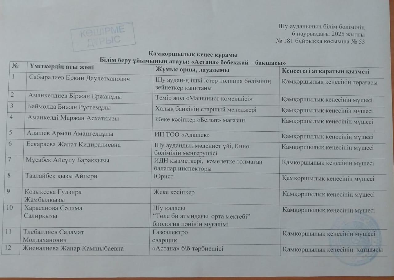 Қамқоршылық кеңес құрамы » "Жамбыл облысы Шу ауданы Шу каласы "акимынын аппараты КММ “Астана” бобекжай- бақшасы” коммуналдық мемлекеттік қазыналық кәсіпорны